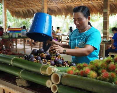 สวนสําเร็จ ริเวอร์ไซด์ เดิมที่เป็นสวนผล ไม้แบบผสมผสาน ให้ผลผลิตปีละ1-2ครั้ง ตามฤดูกาล ทางผู้ประกอบการจึงเล็งเห็นว่า เพื่อให้ได้ประโยชน์จากการใช้ที่ดิน สูงสุด ควรปลูกพืชที่สามารถให้ผลผลิตได้ ตลอดทั้งปี จึงได้มีกวีปรับเปลี่ยนพื้นที่เป็น สวนสละ แต่ยังคงเหลือพืชบางส่วนไว้เป็น ร่มเงาอยู่บ้าง เพื่อเป็นการเพิ่มมูลค่าจากการขายสละ สดเพียงอย่างเดียว จึงได้มีการจัดตั้งกลุ่ม ผลิตสละลอยแก้วขึ้นมา เนื่องจากสละลอย แก้วสามารถรับประทานได้ทุกเพศทุกวัย เหมาะแก่การนําไปเป็นของฝากและของว่างในงานเลี้ยงต่างๆ ซึ่งสมาชิกในกลุ่มจะเป็นกลุ่มแม่บ้านเกษตรกรในชุมชนมารวมตัวกันผลิตหลังจากเสร็จภารกิจของตนเอง โดยเริ่มจากการวางจําหน่ายภายในชุมชน และขยายแหล่งจําหน่ายออกไปเรื่อยๆ จนเป็นที่รู้จักและได้รับผลตอบรับที่ดีขึ้น ปัจจุบันทางสมาชิกจึงได้มีการผลิตออกมา จําหน่ายเพื่อรองรับผู้บริโภคอย่างต่อเนื่อง